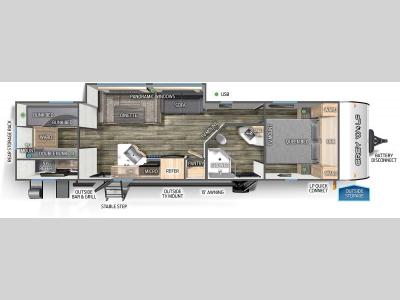 Sleeps 9 Slides 1 Length 36 ft 8 in Ext Width 8 ft Ext Height 10 ft 8 in Hitch Weight 837 lbs GVWR 7837 lbs Dry Weight 6428 lbs Cargo Capacity 1409 lbs Fresh Water Capacity 40 gals Grey Water Capacity 38 gals Black Water Capacity 38 gals Number Of Bunks 3 Available Beds RV King Number of Awnings 1 Awning Info 15' Axle Count 2 Shower Type Neo-Angled Similar Travel Trailer Floorplans
