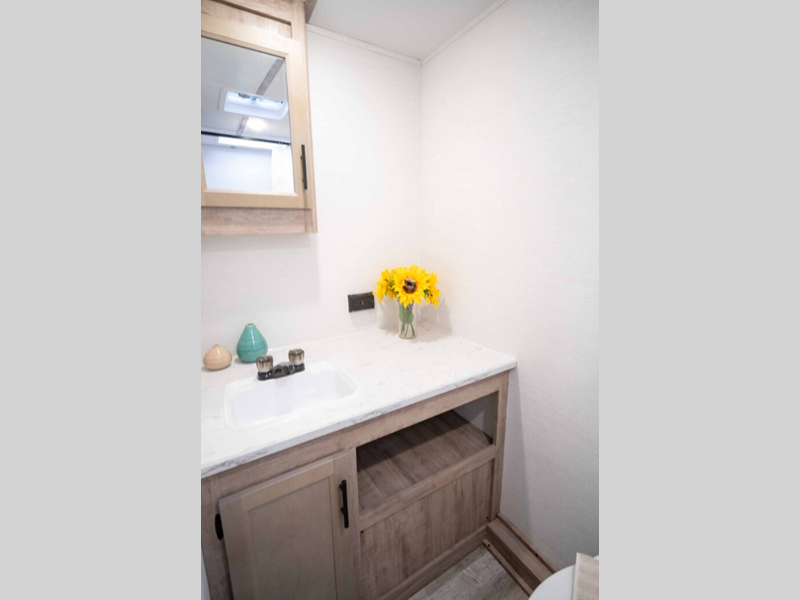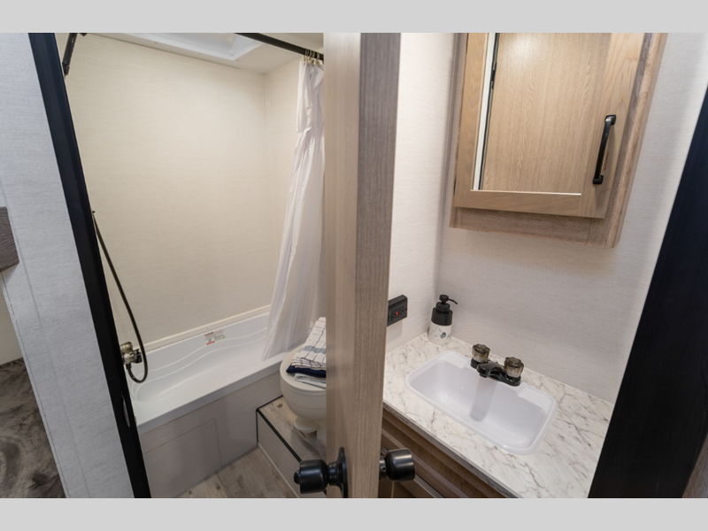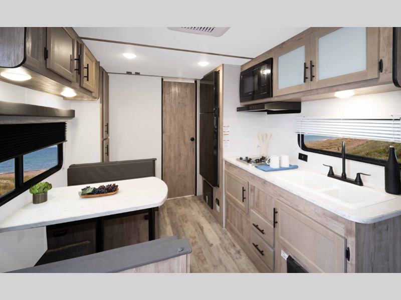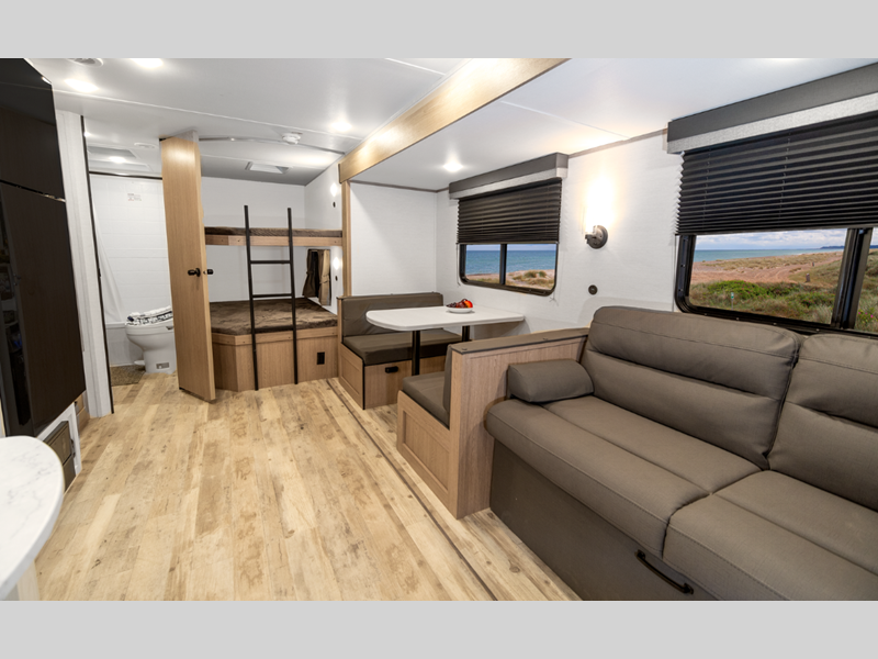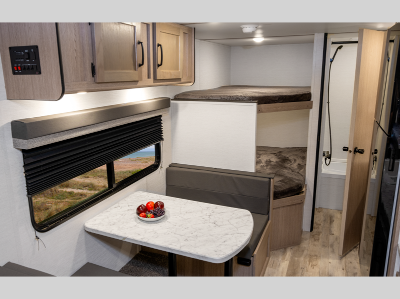 Sleeps 5 Slides 1 Length 23 ft 4 in Ext Width 8 ft Ext Height 10 ft 6 in Int Height 6 ft 8 in Hitch Weight 530 lbs Dry Weight 4430 lbs Cargo Capacity 1300 lbs Fresh Water Capacity 35 gals Grey Water Capacity 34 gals Black Water Capacity 34 gals Furnace BTU 20000 btu Number Of Bunks 2 Available Beds Queen Refrigerator Type Everchill Refrigerator/Freezer Refrigerator Size 10.7 cu ft Cooktop Burners 3 Number of Awnings 1 LP Tank Capacity 20 lbs Water Heater Type Tankless AC BTU 13500 btu Awning Info Electric with LED Lights Axle Count 2 Number of LP Tanks 1 Shower Type Tub/Shower Combo Electrical Service 30 amp Similar Floorplans
