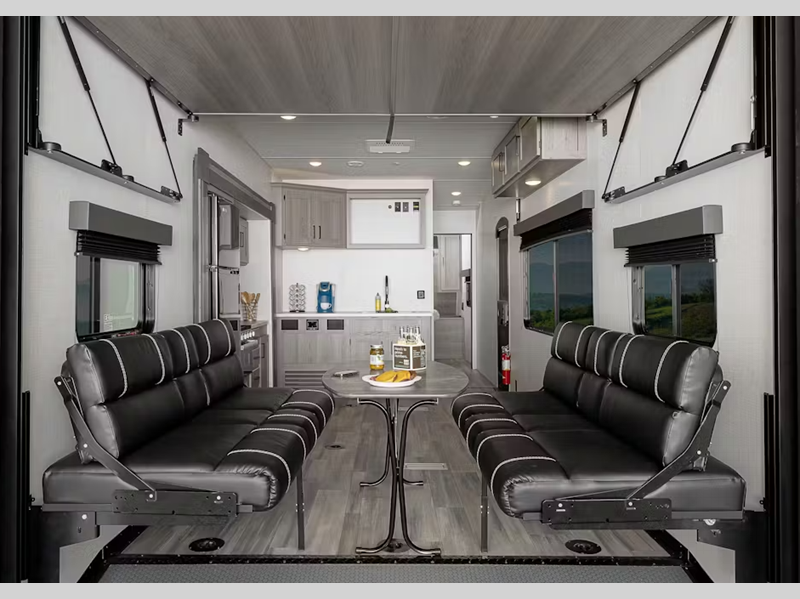 You will appreciate the DynaSpan floor decking in the garage that can withstand your adventures plus 5,000 lb. frame welded tie-downs to keep your toys secure. The Extreme Weather Package will help extend your camping season and the large tinted safety glass windows provide protection against the suns rays. Each model includes designer style vinyl flooring throughout, LED lighting, and many more interior comforts.