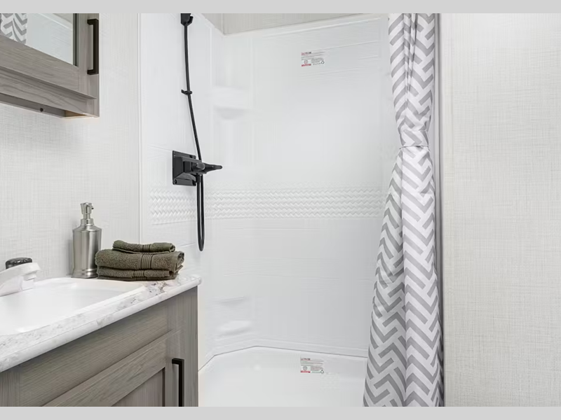 - Fiberglass, 1-piece shower surround, removable shower head, features built-in skylight